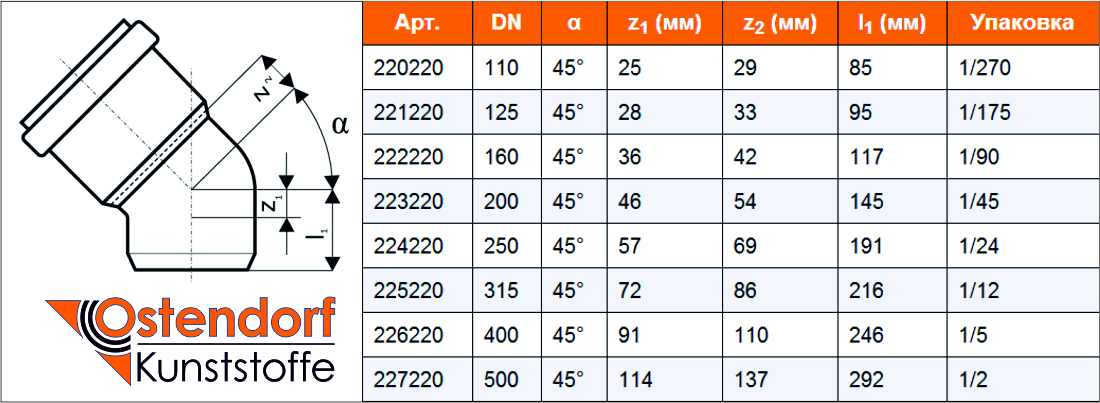 Отвод ПВХ для наруж. канализации 110/45°, артикул - 22.02.20