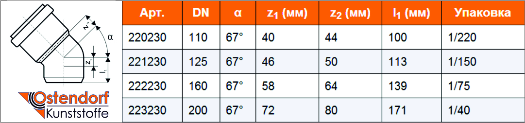 Отвод ПВХ для наруж. канализации 110/67°, артикул - 22.02.30